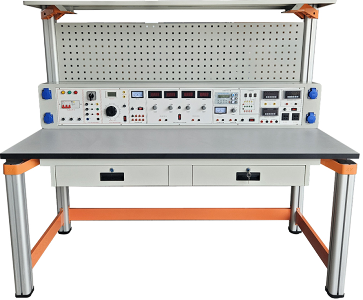 实训桌后面二支截面尺寸70×70mm桌脚向上延伸,与一次成型铝压铸框架连接构件构成(非焊接工艺)牢固的支架,与网孔工具挂板、仪器架、电源控制箱组成一个完整的实训屏。
