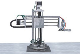 搬运机器人:检测单元检测到产品分类信息时,通过通信网络将检测结果传送到该站,该站通过坐标式气动机器人将从生产线上送来的成品送往全自动堆垛机,主要由四自由度气动机械手组成,电气控制部分由PLC完成。