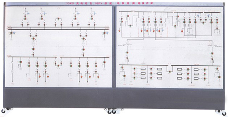 "35kV变电站及10kV供配电系统倒闸操作屏"是针对变电站倒闸操作而专门研制的实训装置。本系统含35kV10kV0.4kV三个电压等级:35kV具有4路进线,双母带联络;10kV侧采用单母分段,两入两出,环网供电;0.4kV侧采用单母分段,并具有备用发电系统。在此典型35kV变电站模型上,学生可以进行各种工况下的倒闸操作。变电站的电压等级和结线方式也可以根据用户要求设计。因此本装置适合各类职业院校供配电类、电力公司、职业技能培训部门等机构的培训、考核。