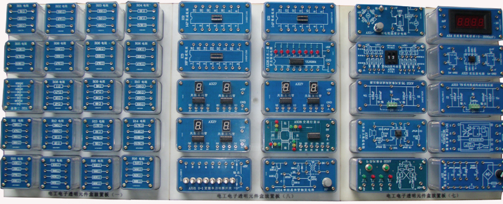 提供电工电子透明实训模块,可以完成直流电路、模拟电子技术、数字电子技术和电子综合应用实训项目。实训模块面板采用PCB板制作而成,器件和信号接口均已引至板上的专用插座,实训模块有四个弹性插脚,与专用实训孔板配套使用。