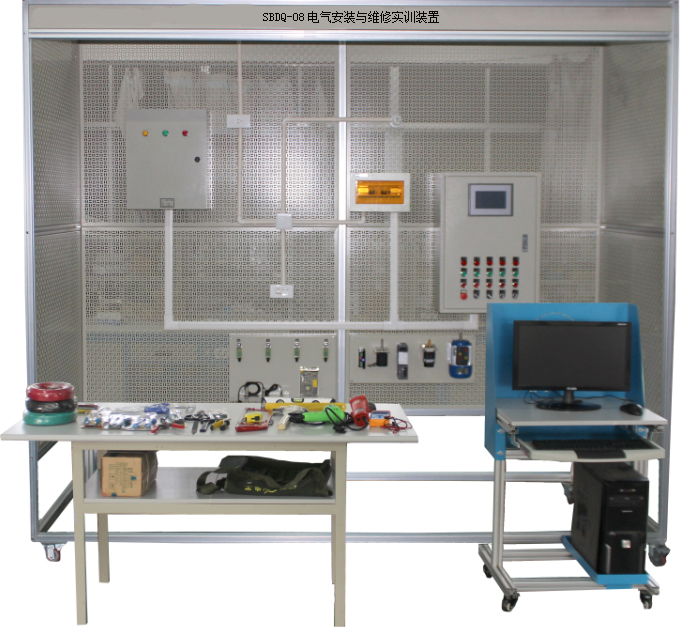 本设备可进行电工安装。如桥架安装、PVC管安装、吊灯、白炽灯座、日光灯、开关、插座、配电箱、控制箱等,装置还包含有交流异步电动机、直流电动机、步进电机、伺服电机、温度控制器、电偶、PLC、变频器触摸屏、消防联动、防盗报警、视频监控等控制与受控对象。该系统每个操作组配套一可移动式工具车和元件柜,便于对元件的保管和安装施工。从根本上解决了学校在普通墙面上进行的安装培训的使用不方便、实训范围窄的问题