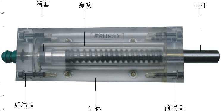 2、弹簧回位油缸的缸体,端盖等均采用了进口透明有机玻璃材料精制而成,透明清晰,顶杆采用45#中碳钢材料,并配合油接头、密封圈、内六角螺丝等标准件装配而成,通过它可明确地观察到活塞、顶杆、油封、油孔、弹簧等结构及其运行过程,具有形象逼真,性能可靠等腰三角优点,它即可作为教学模型,也可作为液压实验元件进行实验演示。