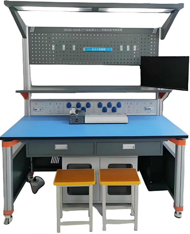 三、 电子产品装调与人工智能创新考核设备功能特点:该设备主要由工作台、实训屏、实训屏模块、工具柜、电路实训模块
