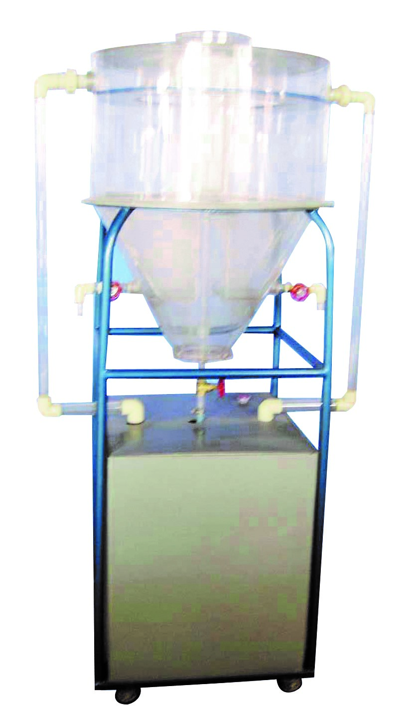 有机玻璃水力循环澄清池、PVC水箱、不锈钢进水泵、转子流量计、中心导流调节器、进水喷嘴、污泥导流器、污泥斗、排泥阀、出水平衡槽、不锈钢台架、排水管、防污电器控制箱、配套连接管阀。