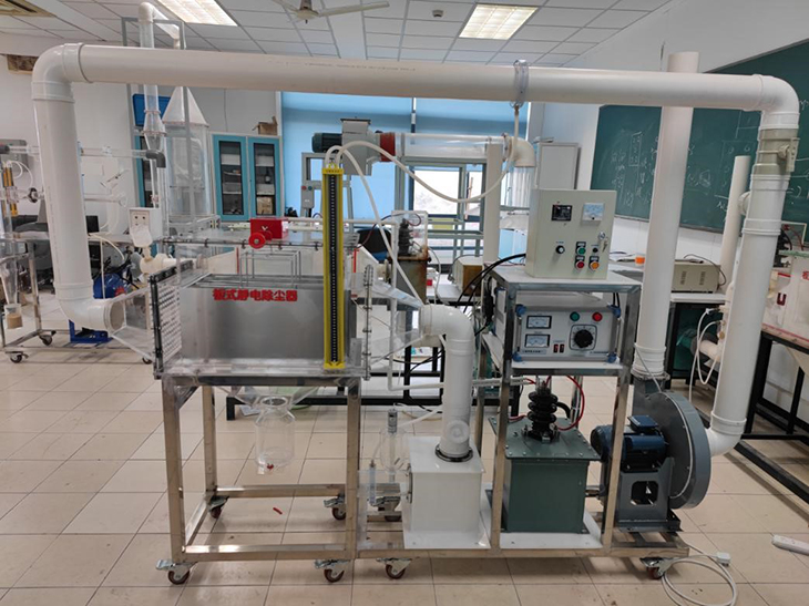离心风机、旋风分离器、袋式除尘器、静电除尘器、高压静电发生器、机械振打装置、风量调节阀、发尘箱、集尘装置、管路、U型压力计、毕托管流量计、振动电机、电路控制柜、不锈钢框架