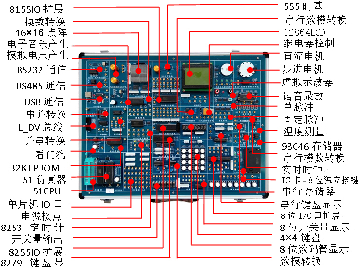 主板上留有L_DV总线扩展接口,可以扩展各种新型接口电路。支持EDA设计应用实验、CAN总线应用电路、以太网络通信应用电路、USB通信电路、2.4G无线通信电路、光柱显示电路、8×8双色点阵、GPS通信、非接触式IC卡读写电路和综合传感器模块等。