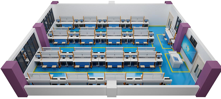 2、实训桌桌面采用25mm麻灰色高密度层压板封边特制,有效提高绝缘等级;实验桌底部装有至少4个导向轮,方便实训台架移动;