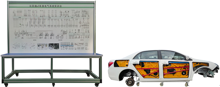 (比亚迪e5 EV450纯电动中欧电子登录)车身电脑、手刹开关、座椅、牌照灯、阅读灯、带移动脚轮钢制底座的中欧电子登录车壳总成(局部解剖)左前车窗电机、右前车窗电机、左后车窗电机、右后车窗电机、左前锁块、右前锁块、右后锁块、左后锁块、电源总开关、保险丝盒、车窗组合开关、中控锁开关、组合开关、左右前大灯总成、左右前雾灯、左右转向灯、左右组合尾灯、牌照灯、灯光开关、倒车灯开关、危险灯开关、刹车开关、雨刮总成、雨刮开关、雨刮继电器、洗涤电机、喇叭、喇叭开关、电动后视镜与开关、音响与导航总成、音响扬声器(6寸200W)、DC12开关电源、点火开关、一体化全铝合金型材搭建的移动台架(2040×650×1800mm (带自锁脚轮装置,带安装检测端子的原理面板,面板1988×1220mm)、故障设置和考核系统、设备操作说明书。