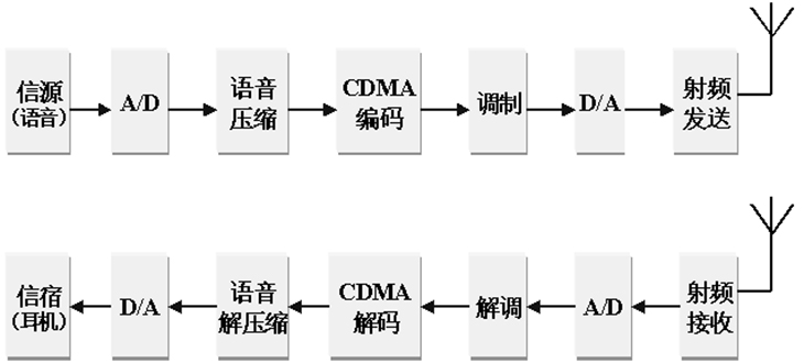 (2)收端:接收、下变频、解调、CDMA译码、扩张、还原语音。