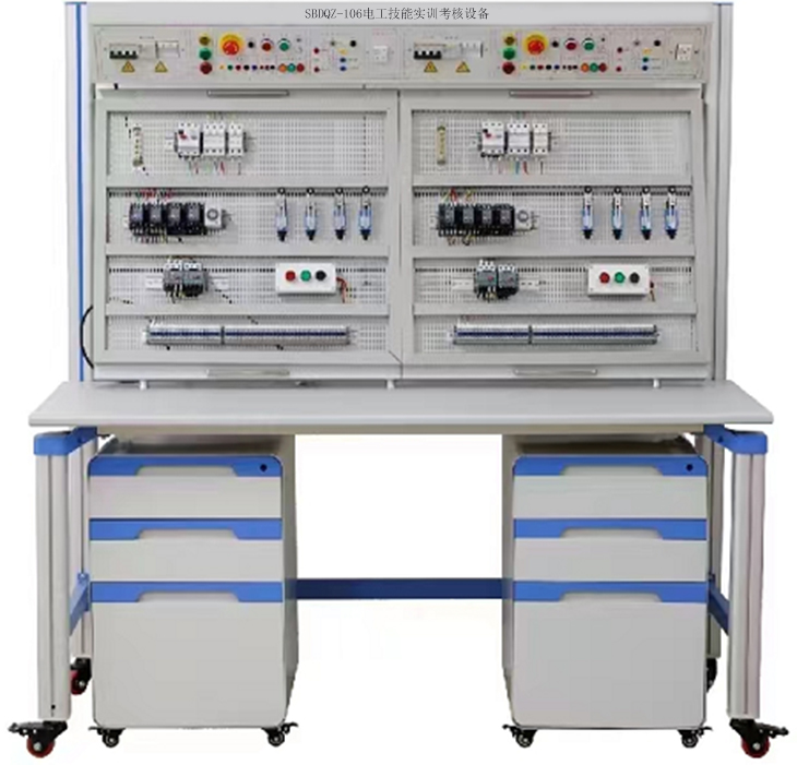 本实训台由实训屏(内置电源)、实训桌、实训储物柜三大部分组成。
