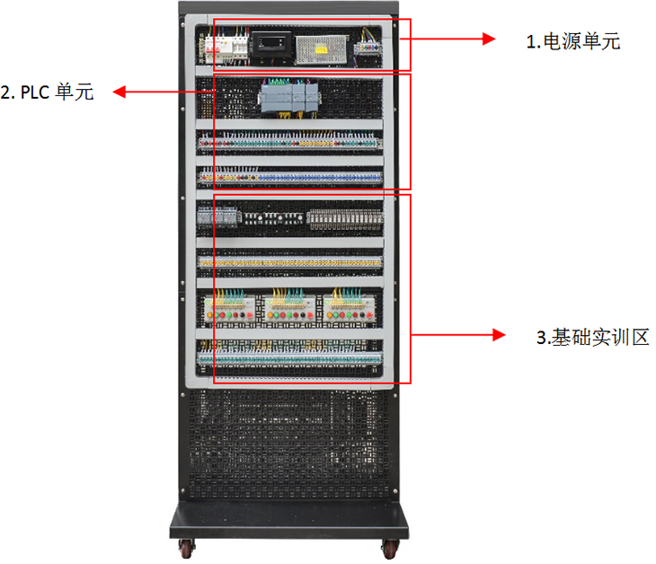 实训单元组成:网孔板实训区主要由电源单元、PLC单元、基础实训单元等组成。