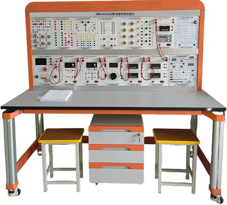 创新电路技能实验平台由实验桌、实验台架、存储柜、实验挂箱组件、配件等组成。