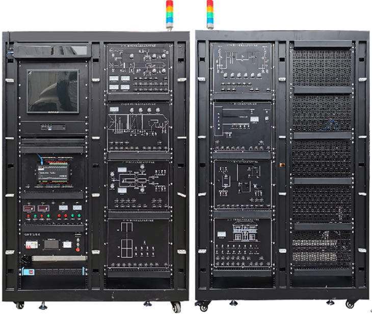 材质工艺要求:不低于1.5mm厚度SPCC冷轧钢板,表面脱脂、磷化、静电喷塑处理; 尺寸(宽×高×深):1225mm×650mm×1930mm(±50 mm); 一体式标准≥19英寸机架,≥4×38U容量,应可安装各种标准机架设备、标准化的功能模块、综合布线机柜设备及可供自由配置的网孔板模块等; 特别设计理线槽、理线环及走线孔,使布线更隐蔽、规范、整齐和美观; 特别设计带理线功能的加强筋,加强电柜面板硬度的同时提供了更多的布线路径; 机架内部、两侧及背部完全开放,学生可以看到所有器件的原始端子、接口及标识,以及二次引线的连接关系; 预留对地进电安装孔和接地柱,满足现场配电需求。 |
