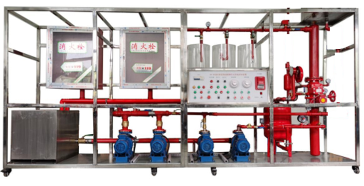 模型框架和水箱等主要部件全部使用不锈钢器件,保证不生锈、不易老化,模拟大楼喷淋灭火系统;模型系统主要由喷淋水泵、气压罐、湿式报警阀、水力警铃、延时器、压力开关、水流指示器、封闭式喷头、试验阀、火灾探测器、火灾报警器等典型喷水灭火设备构成,能生动模拟大楼内水灭火系统的典型结构。
